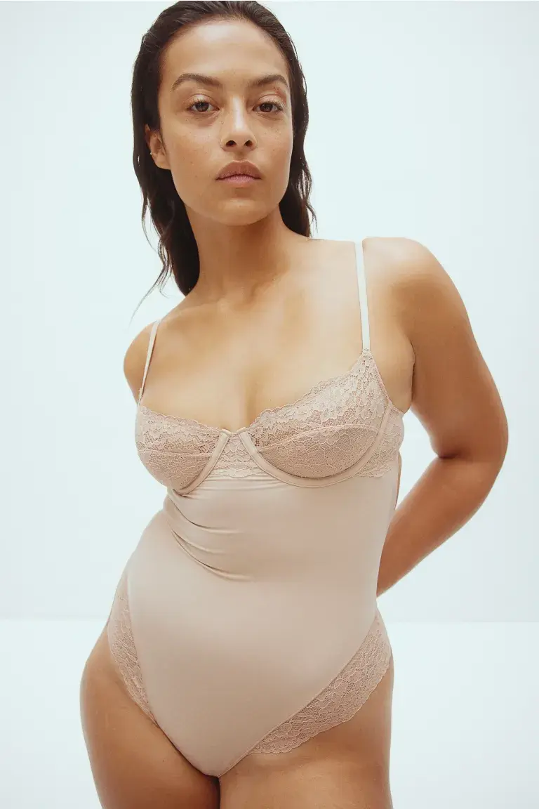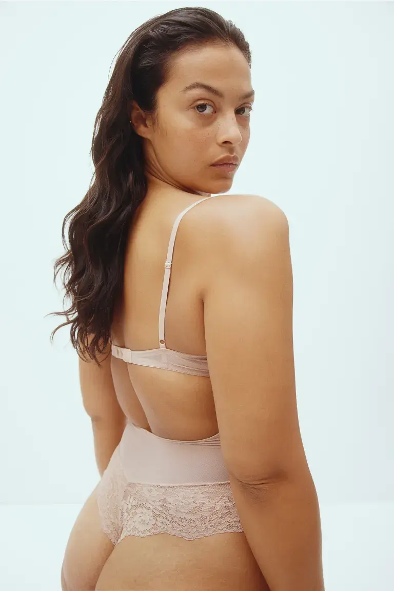 Бренд: H&M Цвет: бежевый Новинка Боди из микрофибры, кружева и сетки с легким корректирующим эффектом на талии. Регулируемые бретели и чашки на косточках с сетчатой подкладкой обеспечивают легкую поддержку и естественную форму груди. Глубокий круглый вырез сзади и узкая застежка на крючки. Мягкая ластовица на потайных кнопках. Высокий вырез сзади. Фасон: Бюстгальтер без подкладок, стринги, бюстгальтер на косточках.