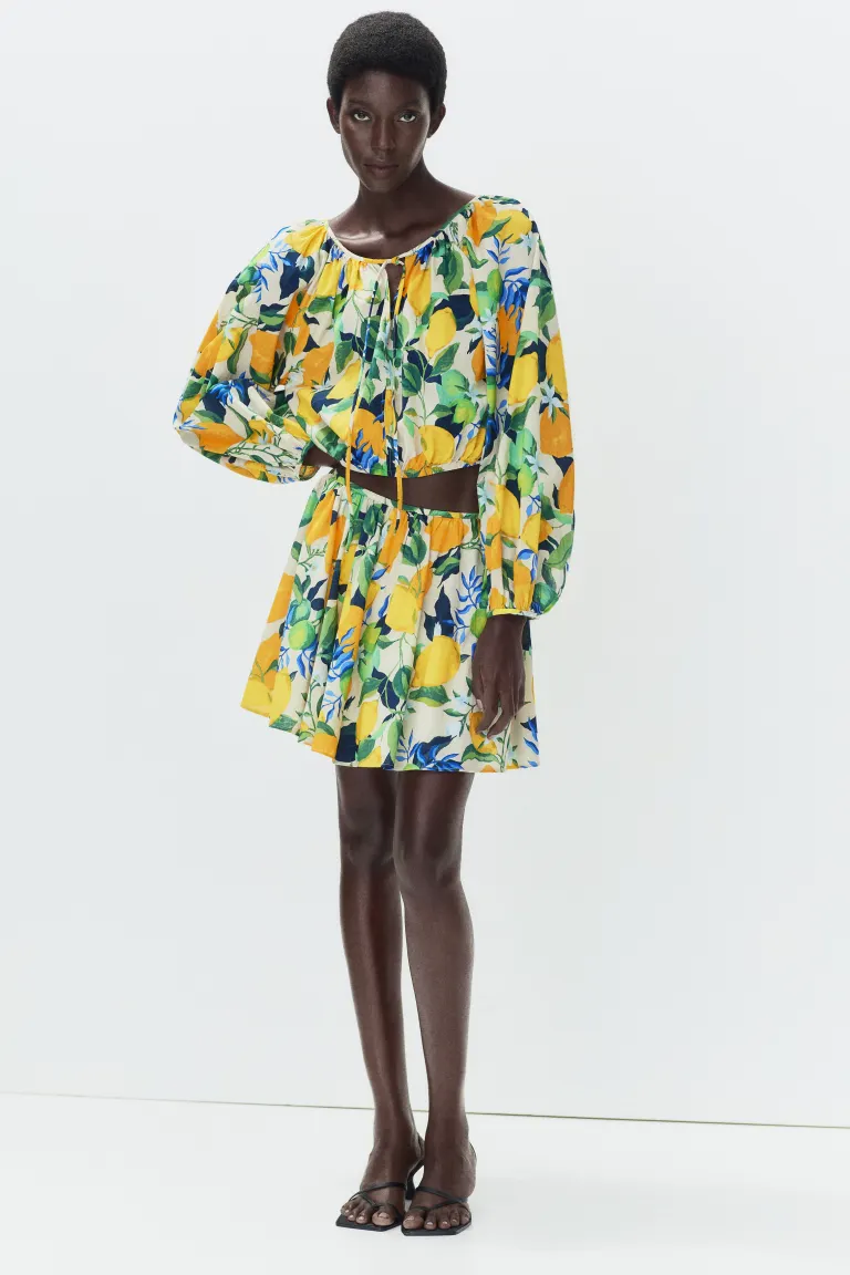 Короткая юбка-солнце из воздушной хлопковой ткани. Высокая талия с узкими завязками по бокам и потайной застежкой на молнию и крючок. На подкладке