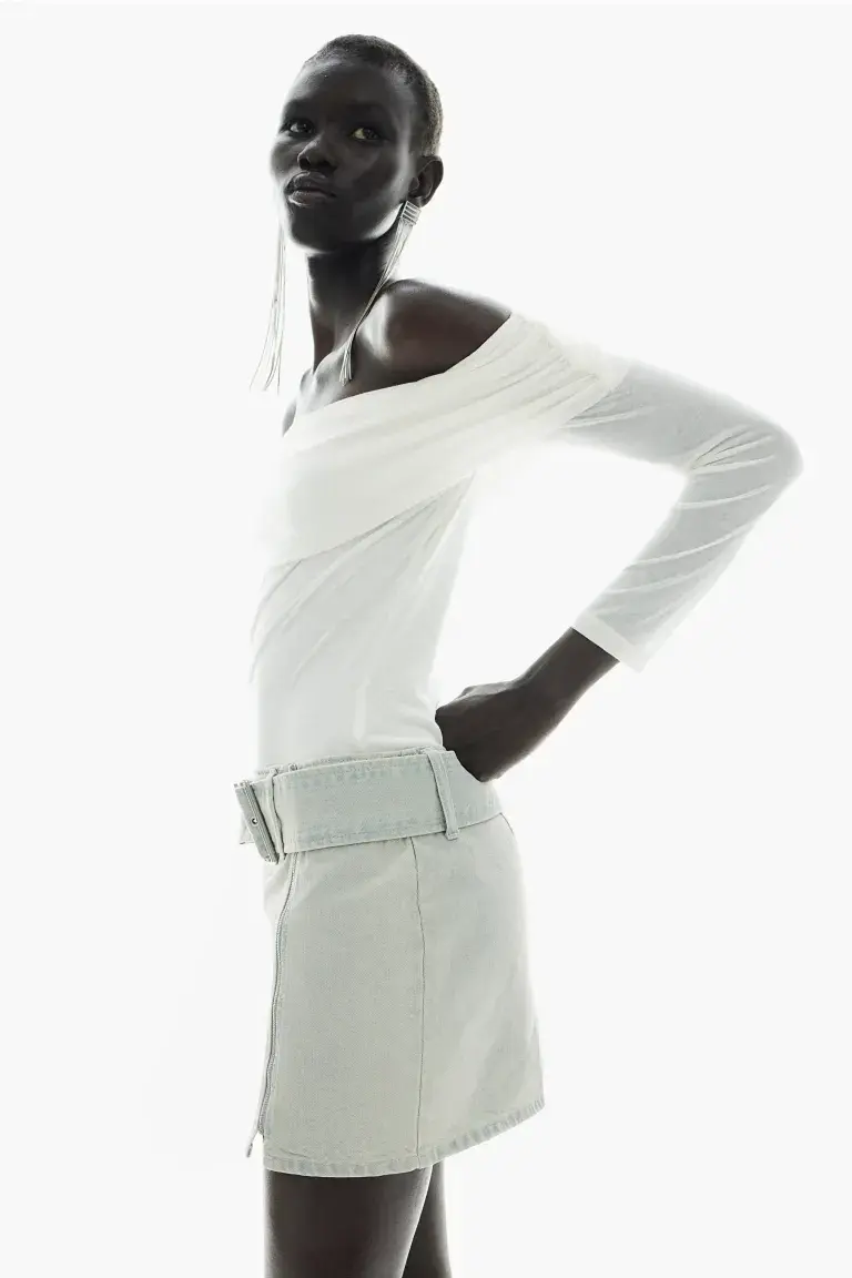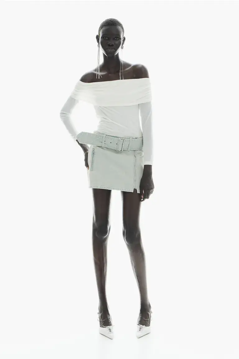 Бренд: H&M Цвет: синий Новая мини-юбка, облегающая фигуру, из плотного хлопкового денима со съемным регулируемым поясом с металлической пряжкой. Спереди смещенная молния и окантовочный декоративный карман на молнии. Без подкладки. Размер: Спина: Длина: 36,5 см (размер 40), Талия: Окружность: 84,5 см (размер 40) Длина: Мини Высота талии: Нормальная высота талии Посадка: Slim Fit Стиль: Schlitz Концепция: РАЗДЕЛЕННЫЙ