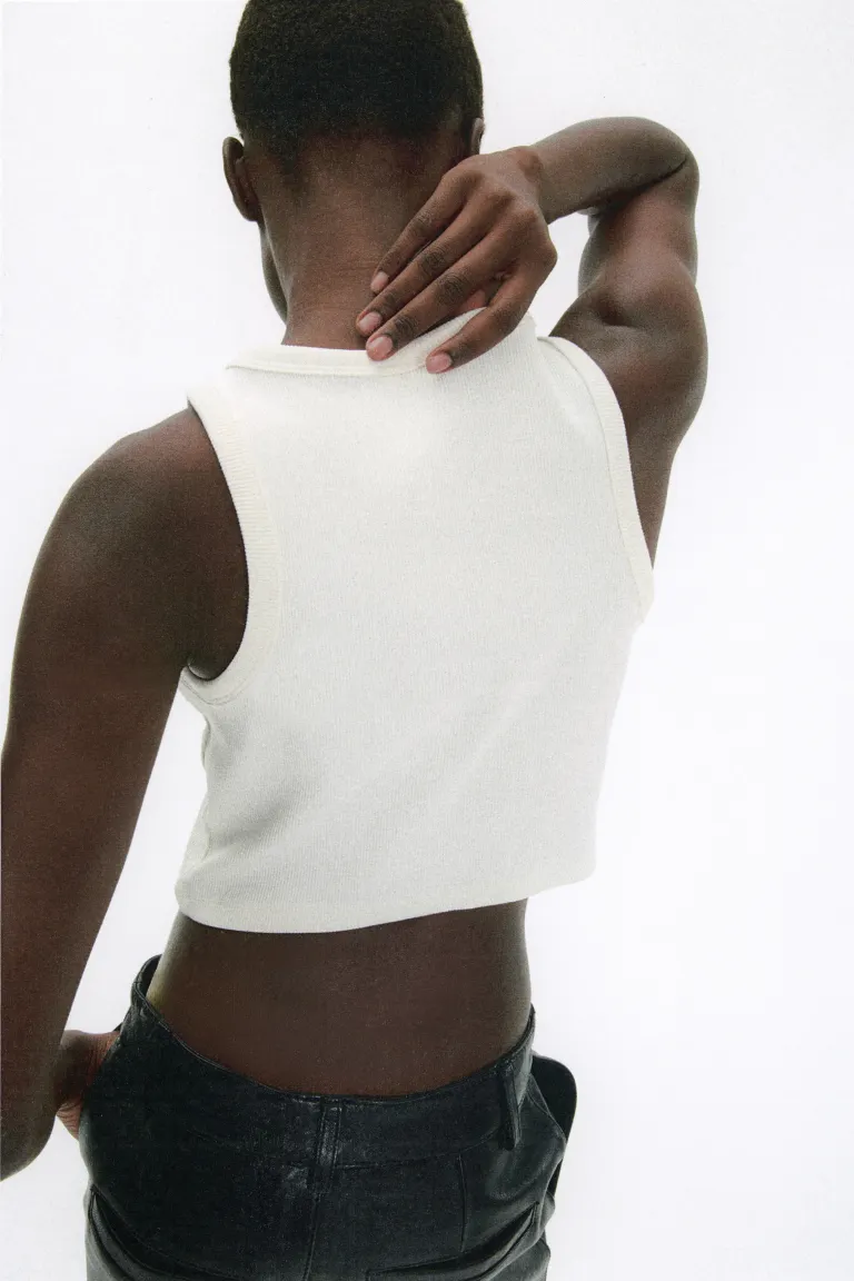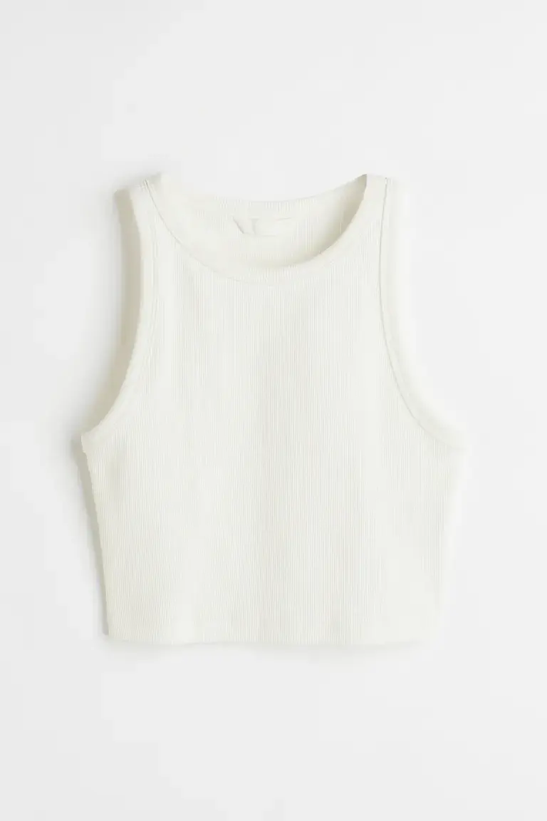 Короткая, облегающая фигуру майка из хлопкового трикотажа в рубчик с узкой окантовкой в области выреза и пройм.