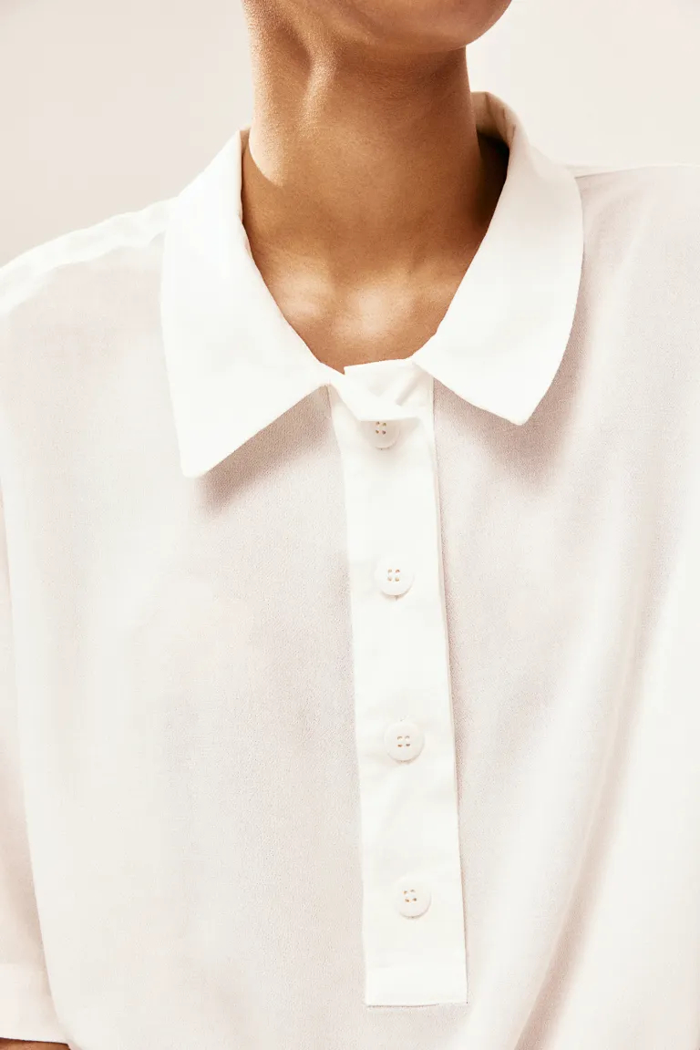 Рубашка-поло из полупрозрачного вискозного крепа с воротником и планкой на пуговицах. Свободный крой, заниженная линия плеча и рукава до локтя. Без подкладки.