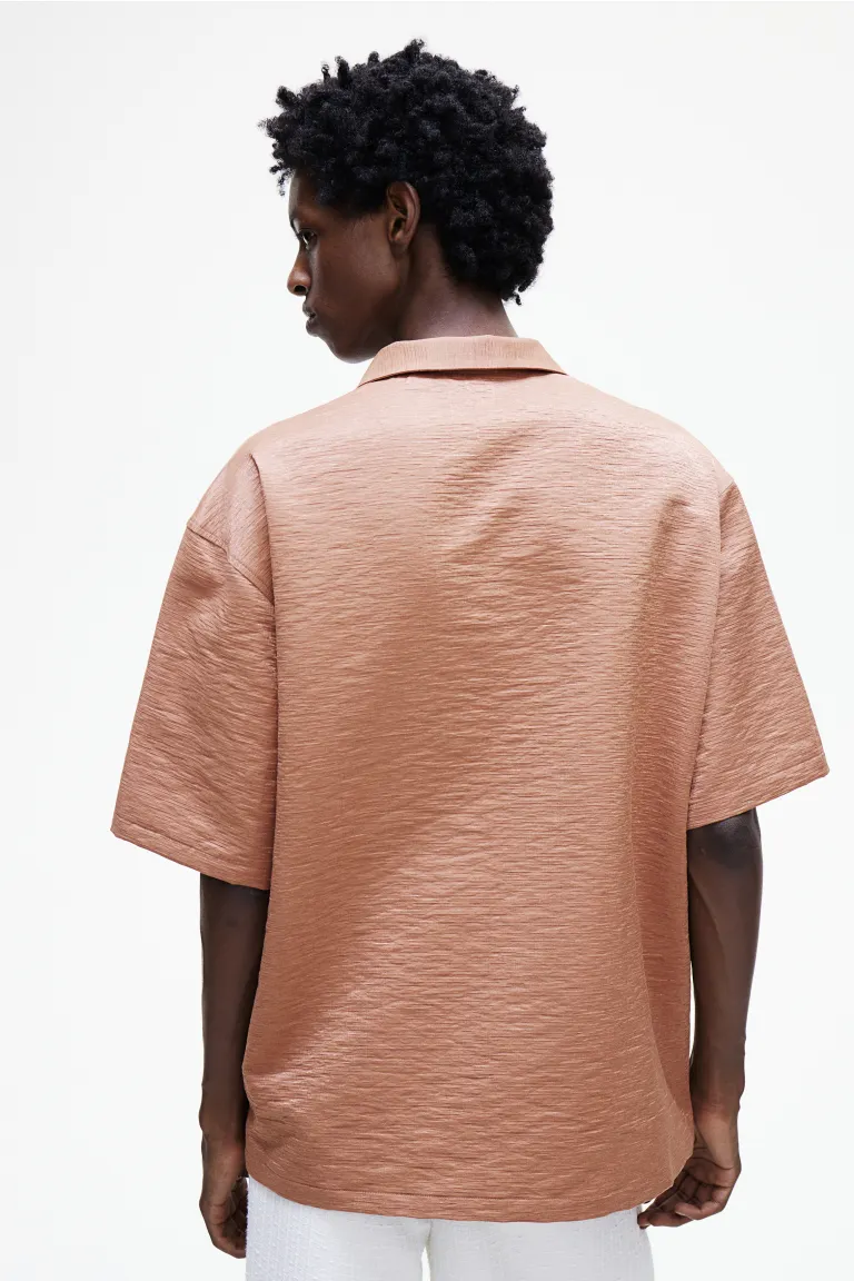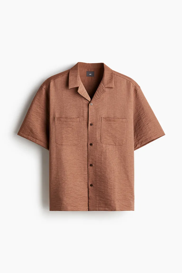 Бренд: H&M Цвет: бежевый Новинка Рубашка с короткими рукавами из мягкой смеси хлопка и льна с воротником с лацканами, планкой с французскими пуговицами, открытыми нагрудными карманами и прямым низом. Свободный крой с объемным, но не слишком большим силуэтом. Длина: стандартная длина Длина рукава: короткий рукав Посадка: свободный крой Воротник: воротник с лацканами