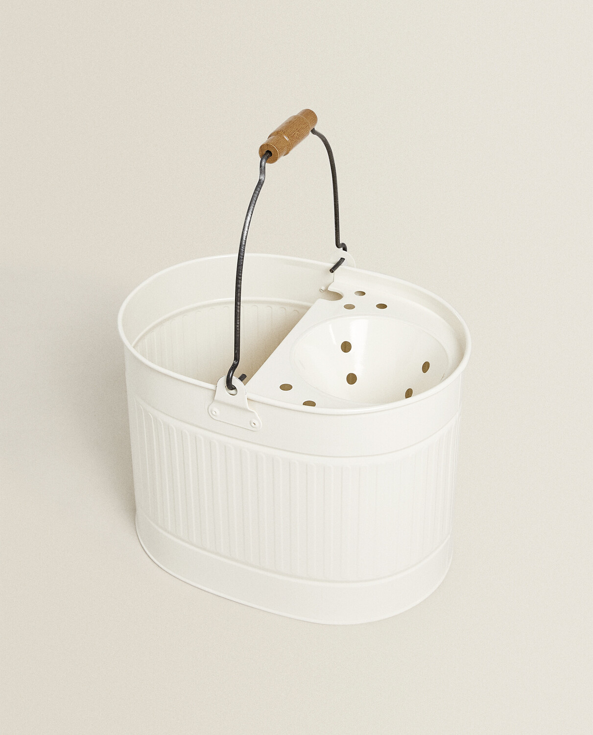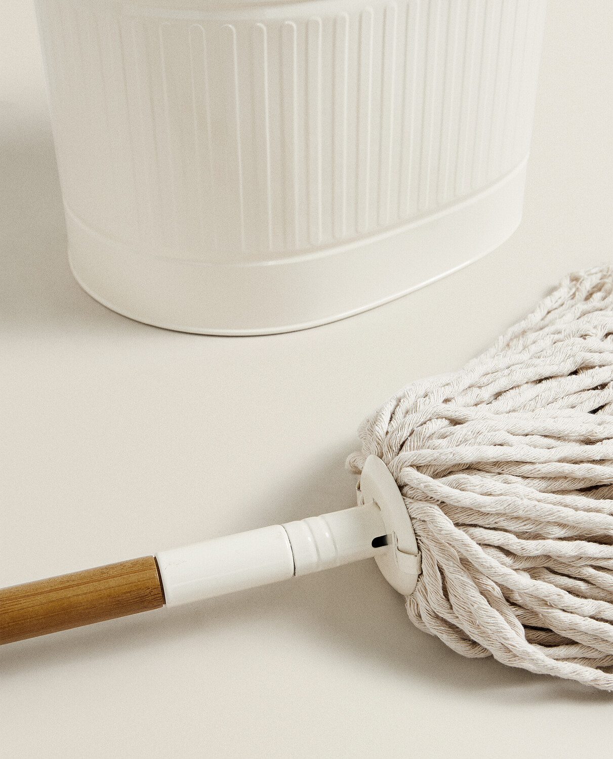 Набор для уборки, состоящий из швабры с деревянной ручкой и ведра с ручкой из оцинкованной стали.