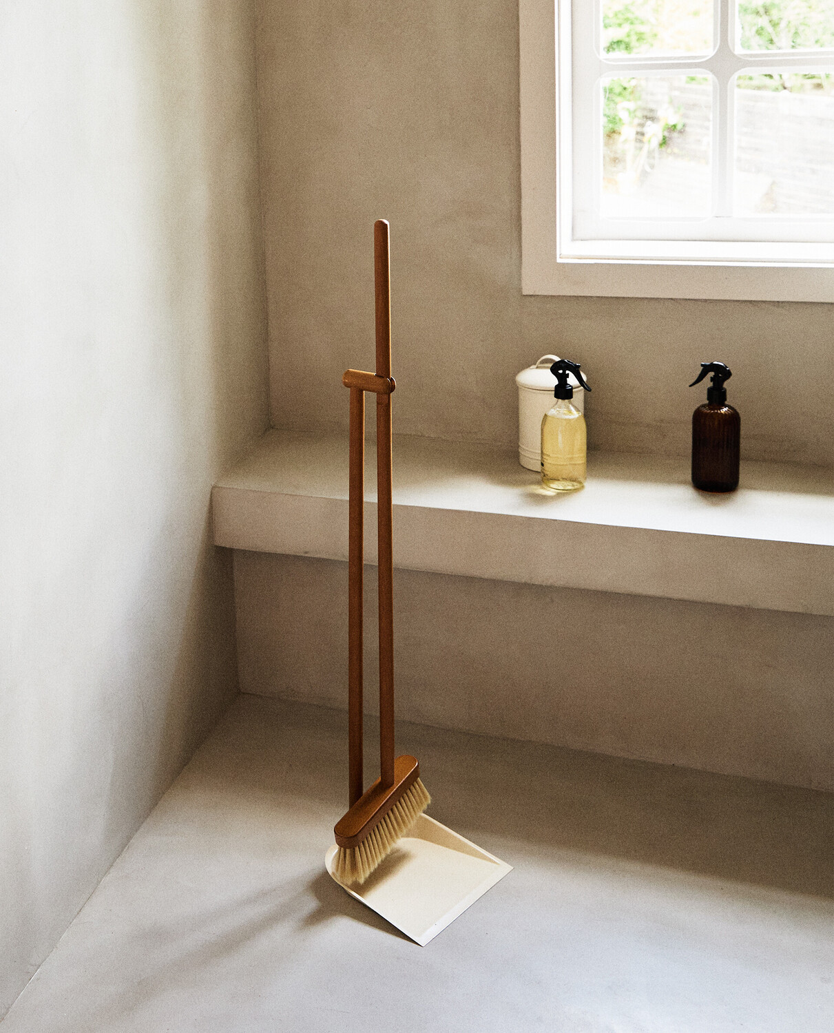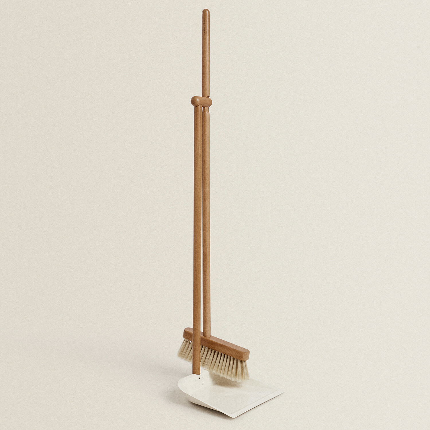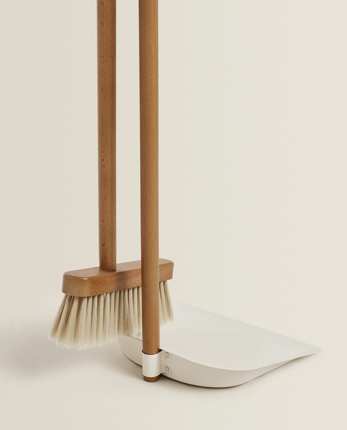 Деревянный совок и щетка с акриловой щетиной и ручкой из бука. Совок из лакированного металла. Щетка крепится к ручке совка в двух разных положениях, чтобы приспособить ее к любому месту хранения.