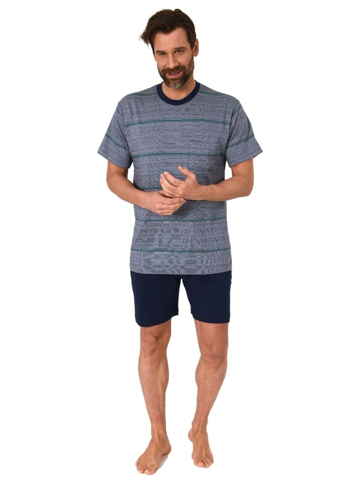 Мужские пижамы с короткими рукавами в полоску - тоже в стиле оверсайз Всегда хорошо одеты! В этой мужской короткой пижаме с короткими рукавами от Normann в повседневном стиле в полоску вы всегда будете выглядеть хорошо, независимо от того, носите ли вы эту короткую пижаму днем в качестве домашней одежды или ночью для сна. Верх пижамы имеет застежку. окрашенная в пряжу полосатая модель, короткая. Пижамные штаны однотонные и идеально сочетаются с верхом.