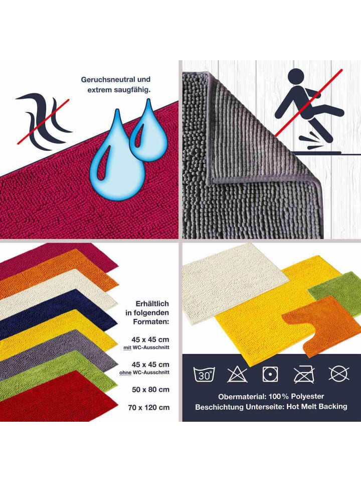 Количество количество несчастных случаев в Бадене шокирующе велико. Ежегодно более 250 000 человек попадают в несчастные случаи в немецких ванных комнатах. Чтобы избежать подобных происшествий, наши коврики для ванной покрыты нескользящим латексом, который не скользит, даже если ванная комната мокрая.