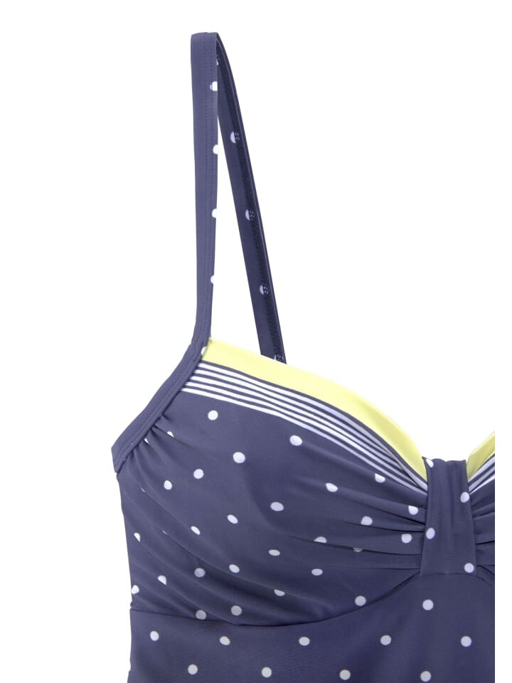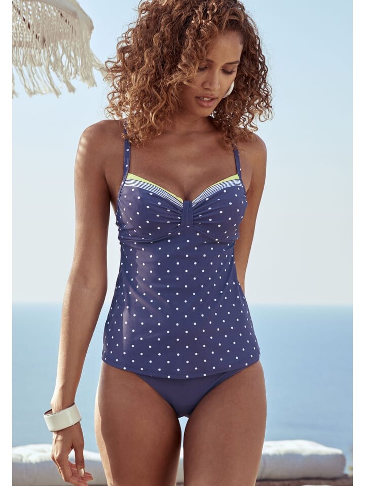 Танкини на косточках Lascana. С принтом в виде полосок и точек. Регулируемые бретели и эластичная подкладка под грудью обеспечивают хорошую поддержку. Сбор между чашками. Смешайте концепцию кино. Комфортное качество.