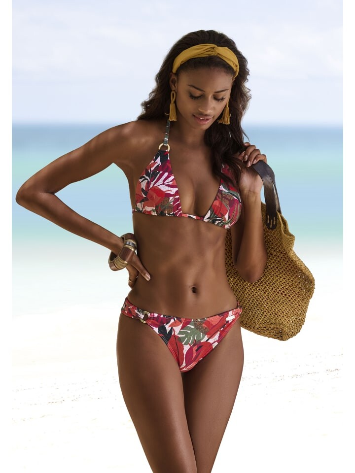 Плавки бикини от Lascana с красивым тропическим принтом по всей поверхности. По бокам блестящие декоративные кольца. Вобтяжку. Микс-кини: можно комбинировать с разными верхами. Эластичное качество из переработанного полиамида.
