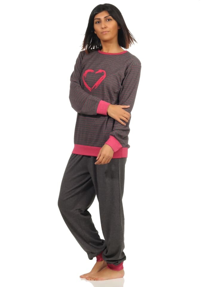 Вам нравится уютно и уютно в прохладное время года? Тогда эта пижама идеально вам подойдет, ведь эти женские пижамы уютного качества интерлок имеют великолепный и элегантный вид, а также уютны, теплы и мягки. Верх пижамы имеет манжеты и выполнен в полоску, штаны пижамы также имеют манжеты, однотонные и прекрасно сочетаются с верхом пижамы. Мотив сердца на верху пижамы завершает великолепный образ.