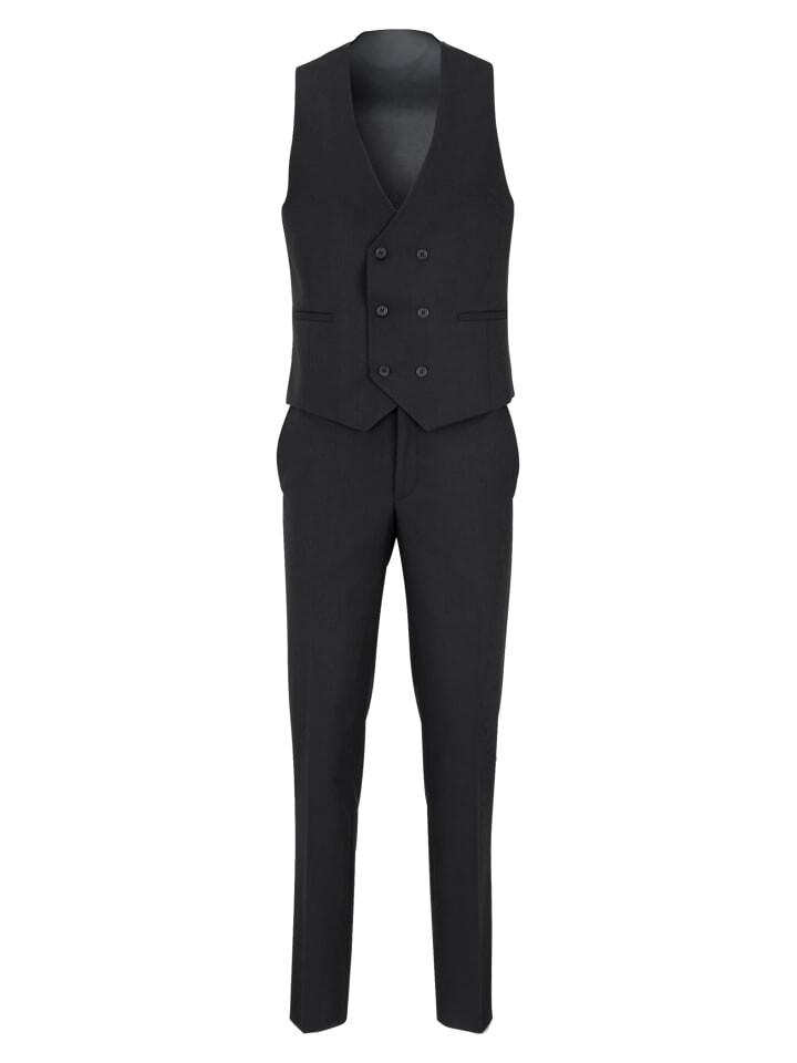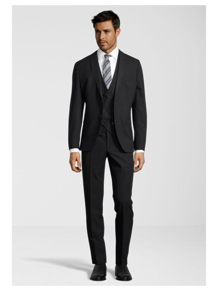 Элегантный костюм-тройка от Steffen Klein черного цвета сочетает в себе современный крой и классические детали. Сочетание приталенного пиджака, двубортного жилета и элегантных, облегающих брюк придает костюму особую индивидуальность. Высококачественные материалы удобны в ношении. Современная куртка с двумя пуговицами имеет слегка подбитые плечи для создания формального силуэта, а также два кармана с клапанами, прорезной карман на уровне груди и несколько внутренних карманов. Помимо боковых карманов, брюки оснащены двумя задними карманами на пуговицах. Спинка элегантного жилета выполнена из качественной блестящей подкладки, обеспечивающей максимальную мобильность под курткой. Костюм-тройка — идеальный выбор для особых случаев, таких как свадьба, крещение, Рождество или Новый год. В зависимости от случая костюм можно носить и без жилета, например, для деловых встреч или важных встреч в стиле повседневного ретро-шика.