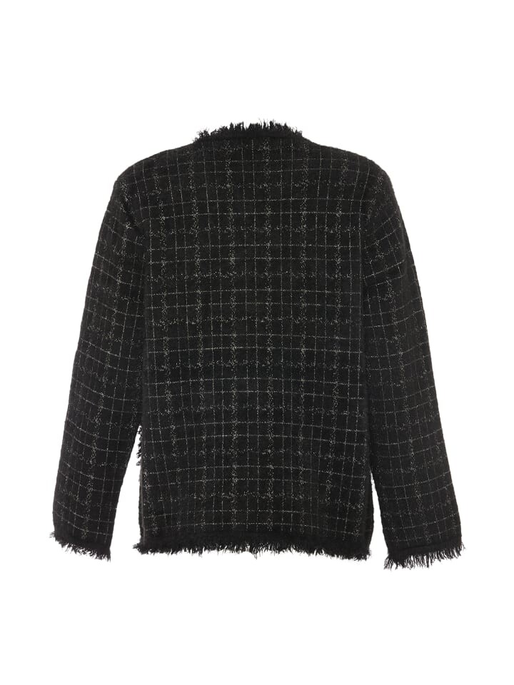 Откройте для себя элегантную куртку с неподвластным времени дизайном. Эта структурированная модель имеет чистый силуэт, дополнена воротником и планкой с пуговицами. Клетчатый узор добавляет глубины, а бахрома на манжетах рукавов, подоле и карманах придает нотку элегантности. Эта куртка с непринужденной посадкой и изысканным внешним видом легко сочетает в себе комфорт и стиль для любого случая.