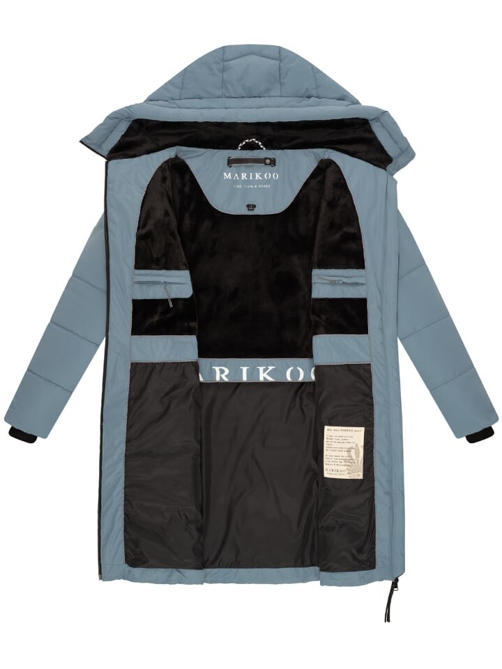 ВИД: Элегантный женский пуховик с супермодными контрастными цветными элементами и уютным капюшоном на мягкой подкладке от бренда Marikoo. МАТЕРИАЛ: Пальто для отдыха на открытом воздухе впечатляет матовым мерцающим водоотталкивающим внешним материалом, наружными карманами на флисовой подкладке и теплые трикотажные манжеты на концах рукавов. Половина внутренней подкладки выполнена из шелковистого гладкого материала, а другая половина - из уютного искусственного меха. пальто по-прежнему можно удобно носить со свитером под ним, капюшон можно застегнуть завязками. Ширину можно регулировать, и вы получаете достаточную свободу движений благодаря двусторонней молнии