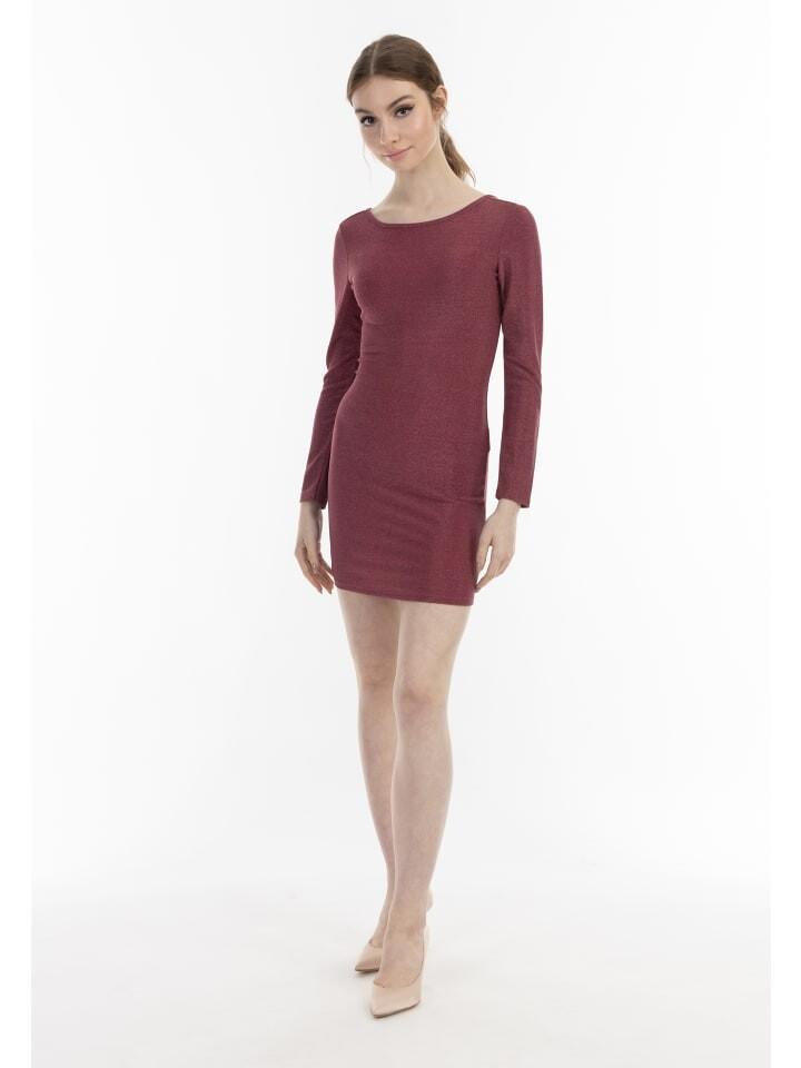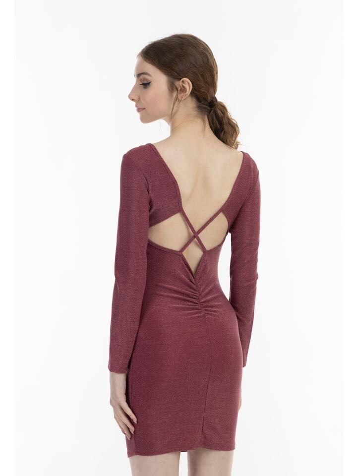 Мерцающие блики придают вечернему мини-платью от myMo особый шарм. Модель изготовлена из эластичного материала и украшена блестящей металлизированной нитью. Широкий вырез сзади со скрещенными бретелями и драпированной деталью подчеркивает женственность облегающего вечернего платья.