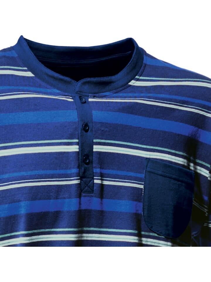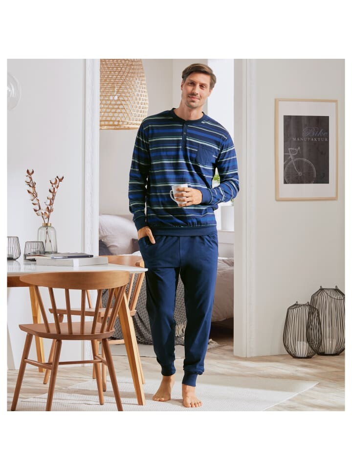 Мужская пижама Erwin Müller из одинарного джерси. Комфортное ночное белье – гарантия расслабленных вечеров и спокойных ночей. Манжеты на рукавах, подоле и штанинах придают модели спортивный вид. Трикотажные полоски, планка с пуговицами на круглом вырезе и нагрудный карман сверху выглядят очень непринужденно. К этому отлично подойдут длинные брюки с широким притачным эластичным поясом и боковыми карманами. Вы будете рады побаловать себя приятным качеством, это настоящее удовольствие для вашей кожи.