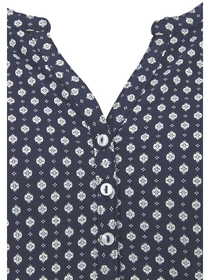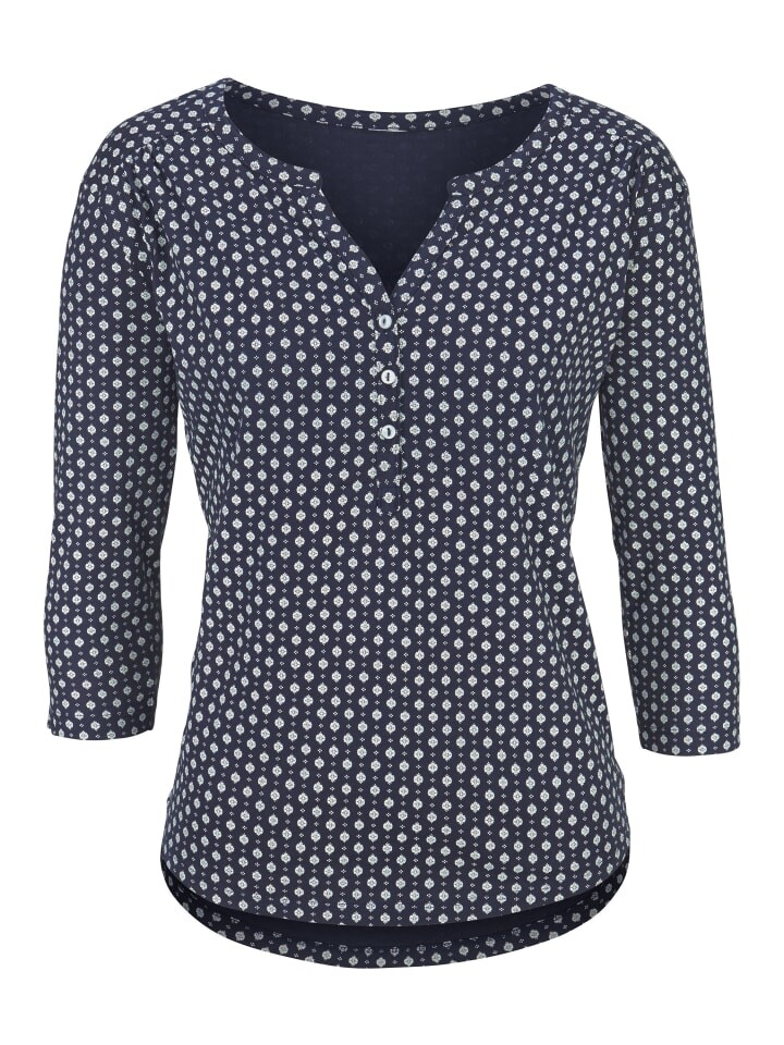 Lascana: рубашка с рукавами 3/4 и декоративными складками на плечах. Специальный V-образный вырез с тремя пуговицами. Слегка закругленный низ. Изготовлен из 65% полиэстера, 35% вискозы.
