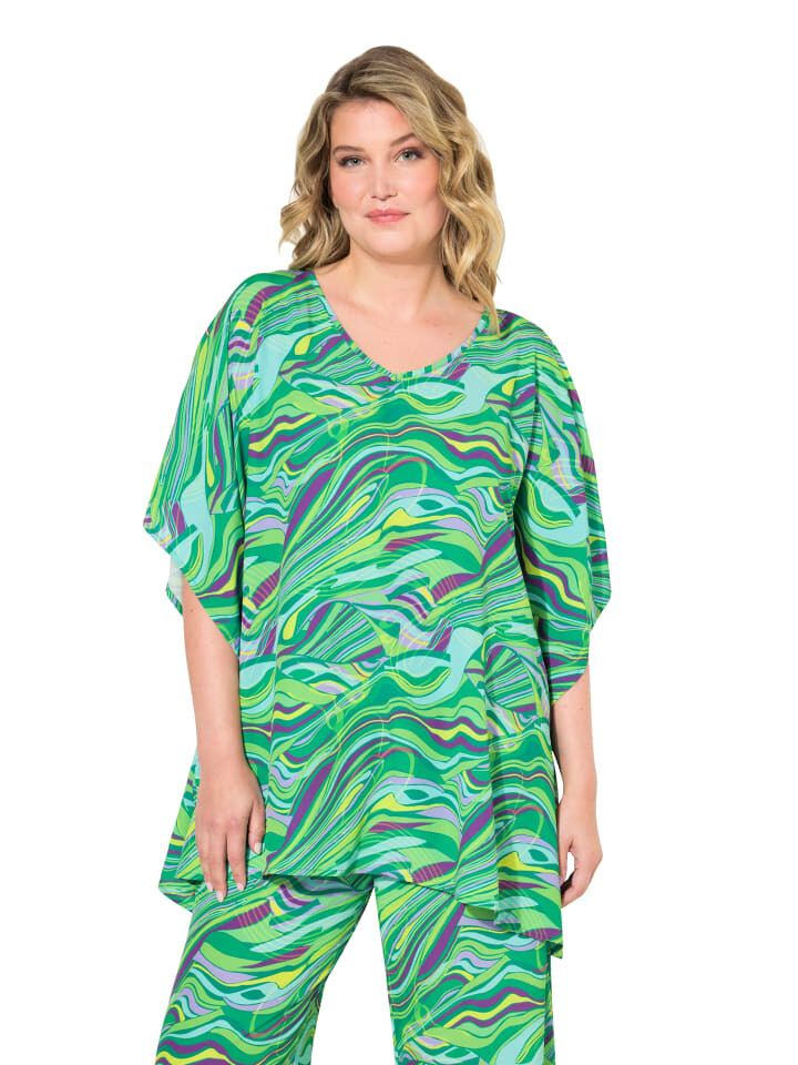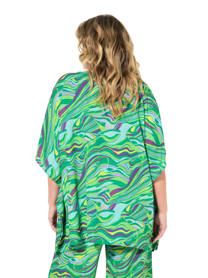 Кафтан свободного кроя из воздушного шифона с тропическим принтом. Округленный V-образный вырез, широкая заниженная линия плеча.