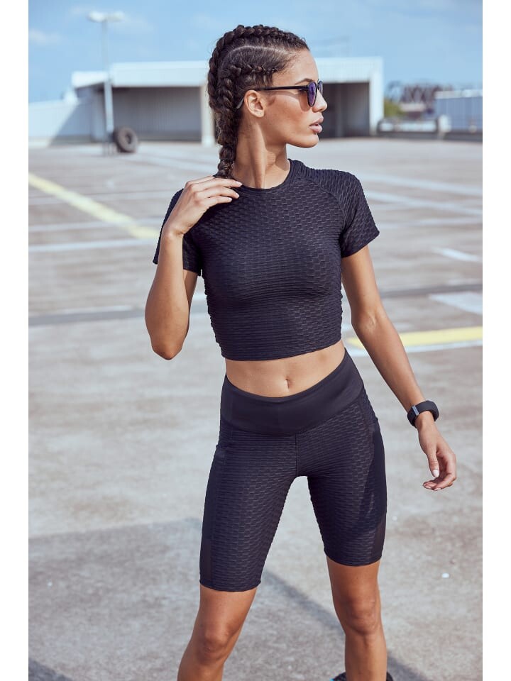Функциональные байкерские шорты сотового типа с широким поясом и внутренним карманом. По бокам штанин сетчатые вставки, слева карман для мобильного телефона. Изготовлено из 86 % полиэстера, 14 % эластана.