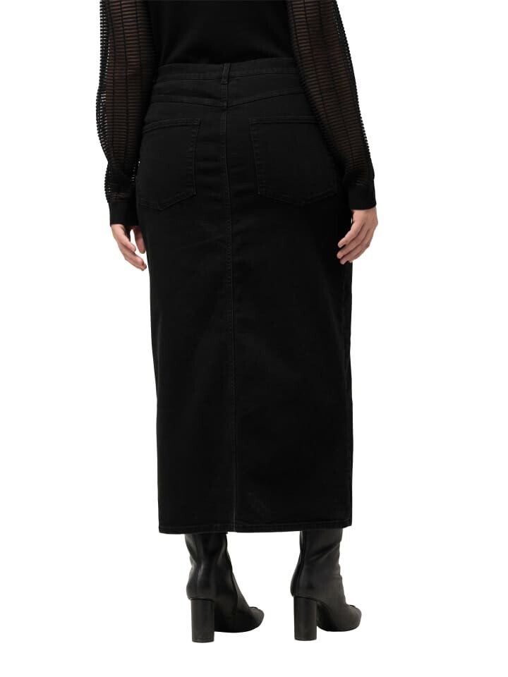 Джинсовая юбка-миди из черного денима. Удобная модель с пятью карманами и разрезом спереди по краю. Комфортный пояс с петлями для ремня, пуговицей и молнией.