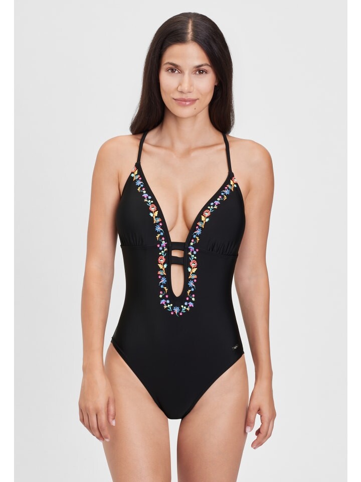 Купальник Баффало. Однотонный дизайн с милой цветочной вышивкой. Изысканное декольте с глубоким V-образным вырезом. Глубокий вырез сзади на перекрещенных регулируемых бретелях. Съемные мягкие чашки. Модный крой. Приятное качество.
