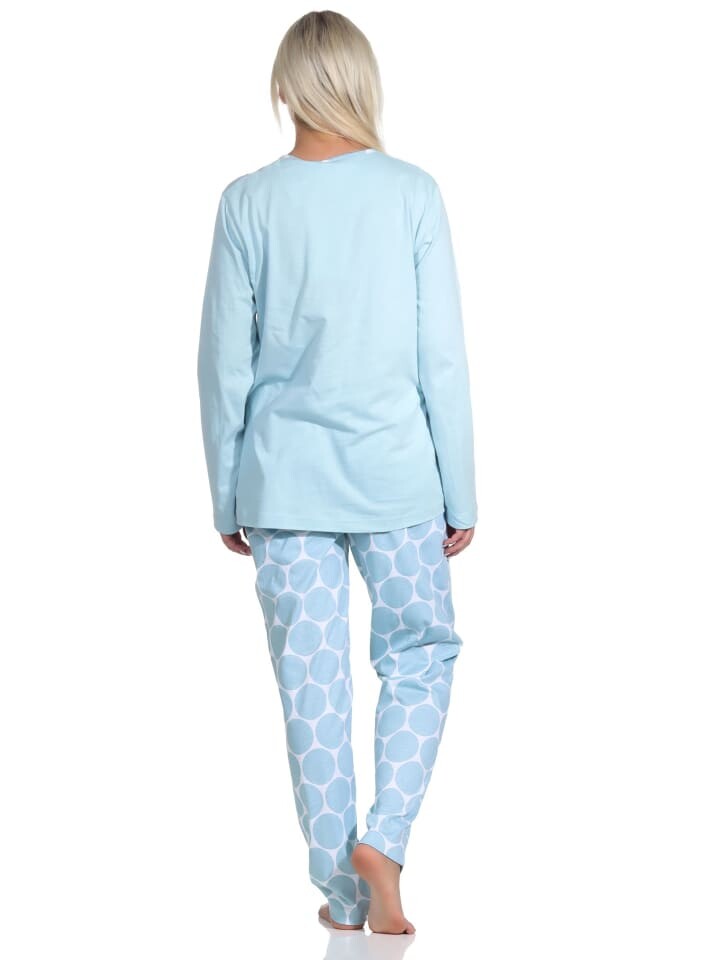 В настоящее время популярны точки или горошек!! В этой длинной женской пижаме в горошек вы всегда будете элегантно одеты, ведь эта пижама абсолютно актуальна! Верх этой женской пижамы с длинными рукавами однотонный и имеет контрастную планку на пуговицах на шее, пижамные штаны из эластичного трикотажа украшены модным принтом в горошек/горошек, имеют карманы и идеально сочетаются с цветом верха.