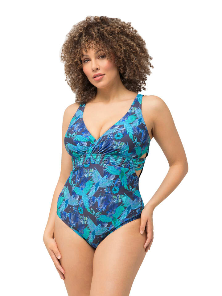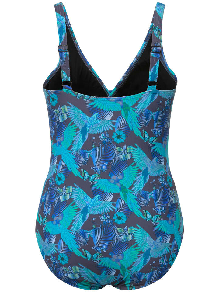 Купальник с мягкими чашками и попугайным принтом. Декоративные ленты под грудью в виде запаха. Регулируемые бретели, пояс под грудью, подкладка спереди. Изготовлено из переработанного полиамида.