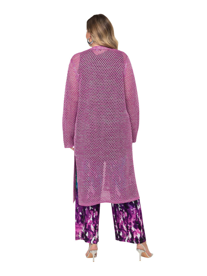 Длинный кардиган из слегка прозрачного трикотажа ажур с элегантным металлизированным эффектом. Длинная открытая форма с длинными рукавами.