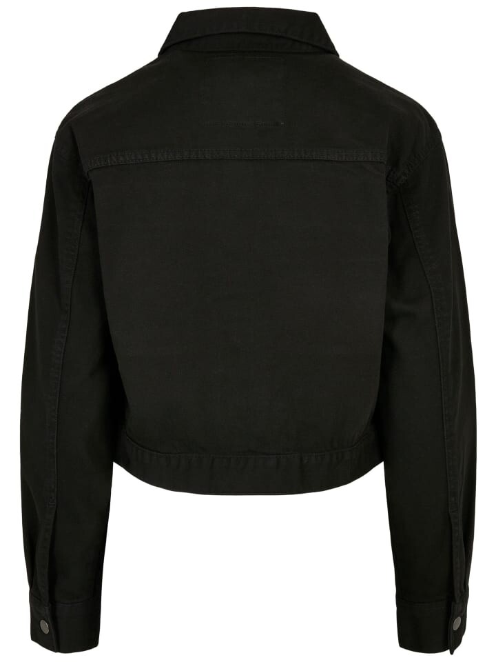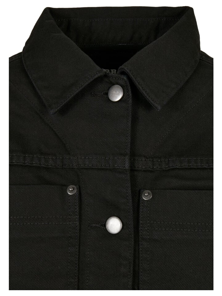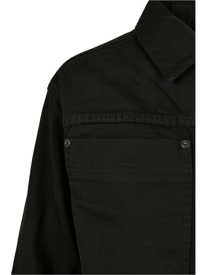 Короткая женская куртка из плотного нескользящего хлопка в стиле джинсовой куртки, прямая и в то же время женственная. Он оснащен типичными деталями, такими как воротник, планка с металлическими пуговицами, два нагрудных кармана с заклепками и сложные манжеты на рукавах. Кокетка сзади завершает уверенный стиль. Женская куртка женственна благодаря своей короткой укороченной длине и повседневному крою оверсайз.