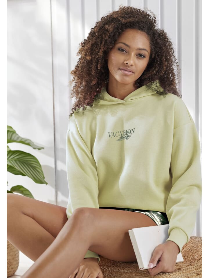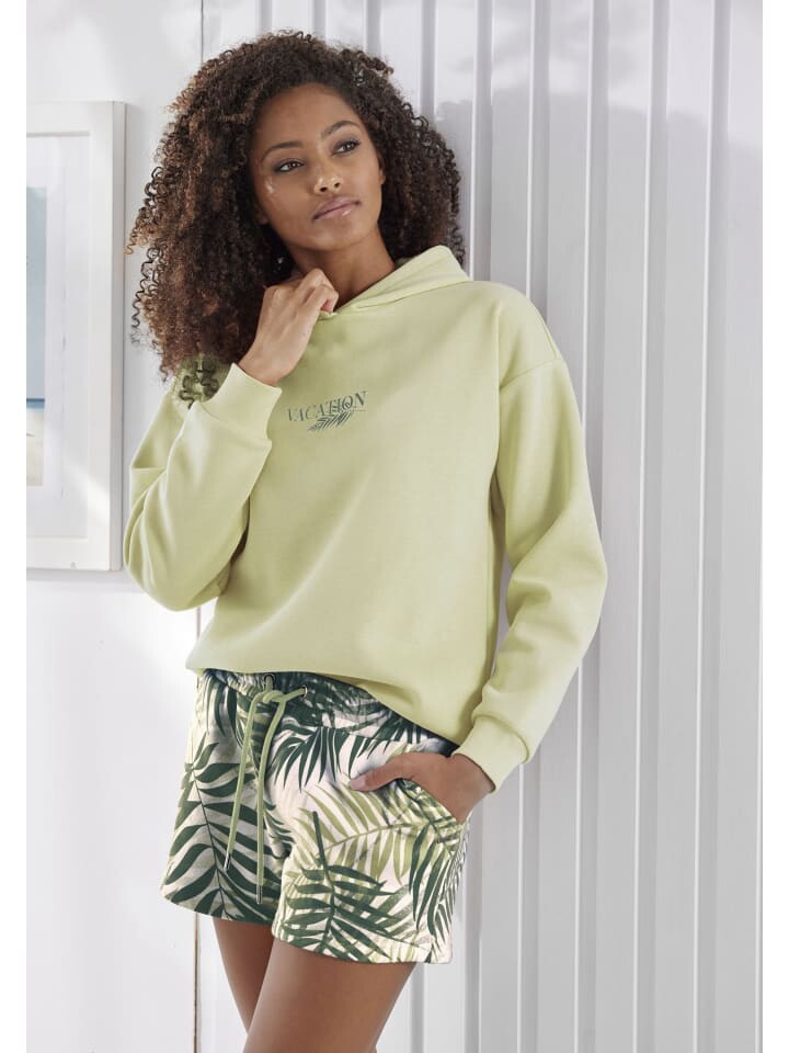 Комфортная толстовка от Lascana с тонким принтом спереди и капюшоном на подкладке. Заниженные плечевые швы. Длинные рукава с ребристыми манжетами. Свободная посадка. Мягкое качество пота.