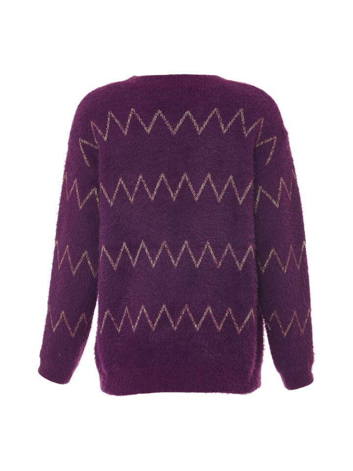 Вязаный свитер от ebeeza из смеси ворсованной пряжи имеет слегка ворсистый вид и захватывающий зигзагообразный узор из пряжи с золотистым эффектом. В дополнение к классической форме он отличается обрезанными плечами и завершающими ребристыми манжетами.