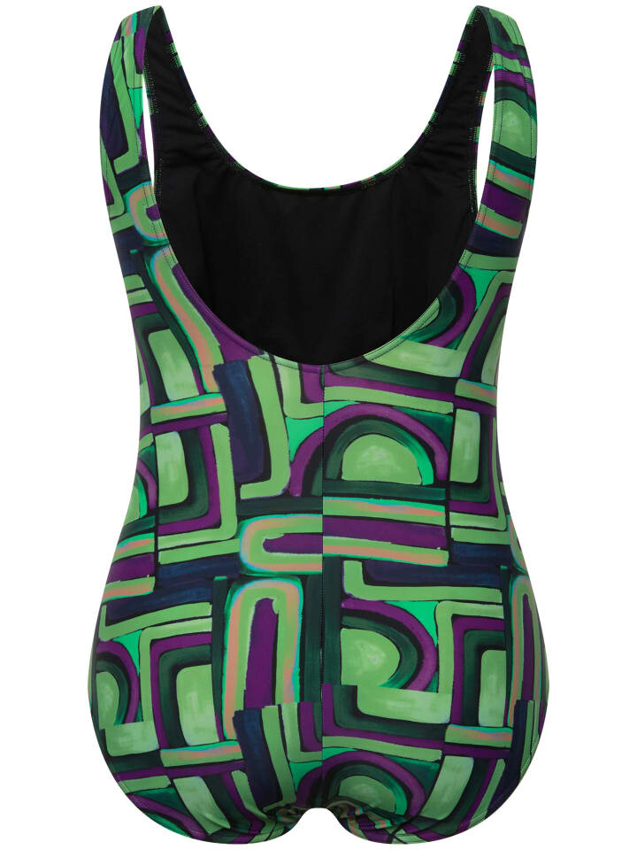 Купальник без мягких чашек, с графическим узором и присборенными по бокам бюстами. Подкладка спереди, пояс под грудью. OEKO-TEX.