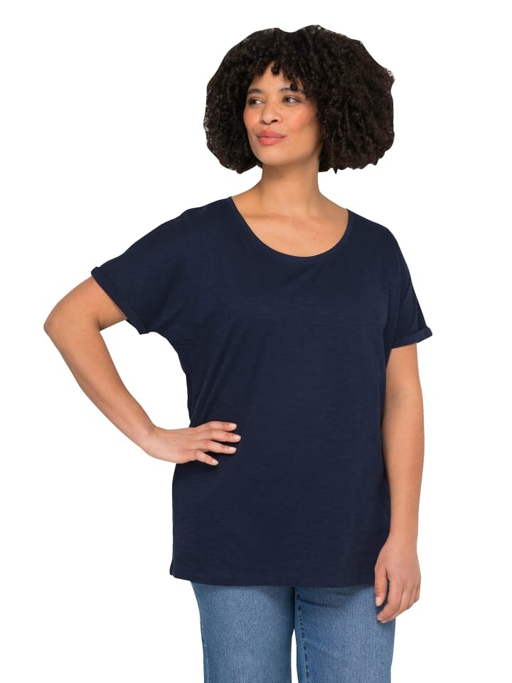 Футболка удобного кроя, с круглым вырезом и полурукавами с манжетами.