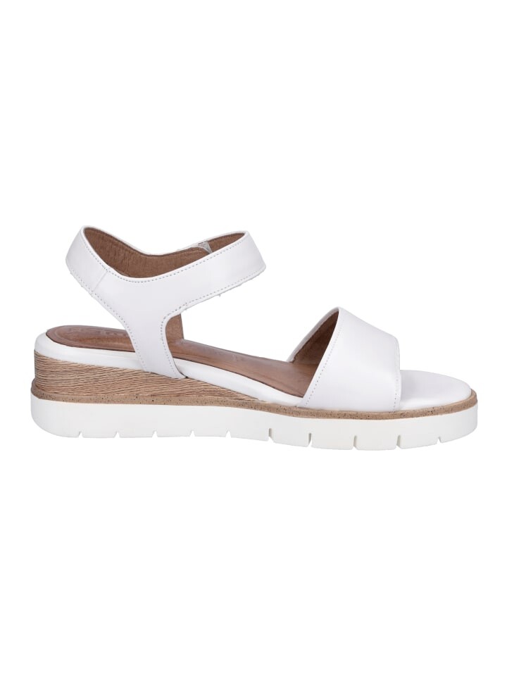 Женские босоножки Tamaris на танкетке из кожи белого цвета с каблуком высотой 6 см, кожаной стелькой и застежкой-липучкой. Материал верха: кожа. Подкладка: другой материал. Стелька: кожа. Подошва: другой материал.