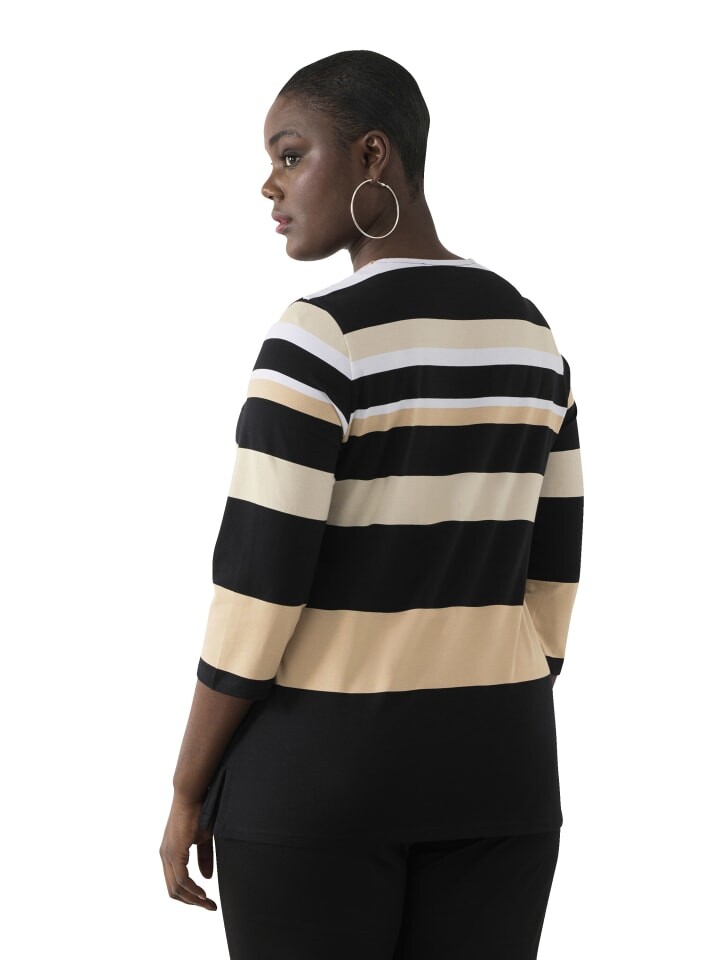 Футболка классического кроя, изготовлена из качественного мягкого хлопка. Модная полоска, круглый вырез, рукава 3/4.