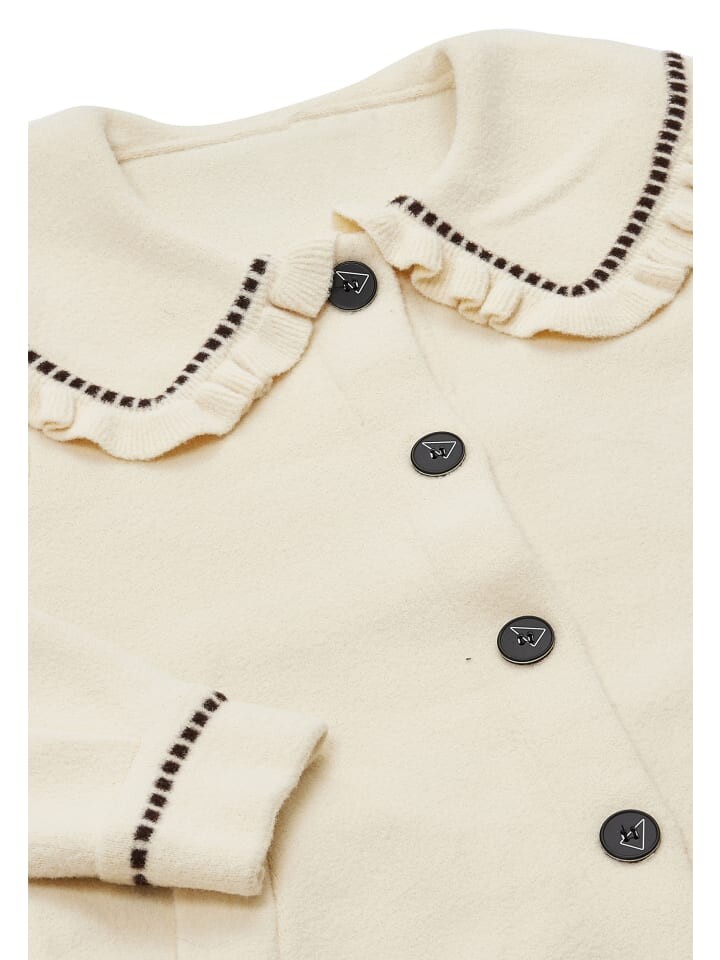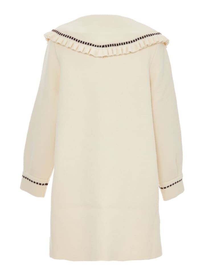 Идеально скроенное пальто имеет классический прямой силуэт. Воротник «Питер Пэн» благодаря зубчатому краю и контрастной отделке добавляет игривости. Передняя застежка, украшенная уникальными треугольными пуговицами с логотипом, излучает изысканность. Длинные рукава с соответствующими манжетами и бесшовно интегрированными боковыми карманами завершают образ.