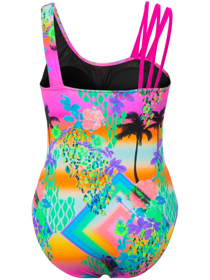 Купальник с мягкими чашками и цветным принтом по всей поверхности. Перевозчик разделен на три части справа. Лента под грудью, поддерживающая подкладка из сетки Powermeet спереди. OEKO-TEX.