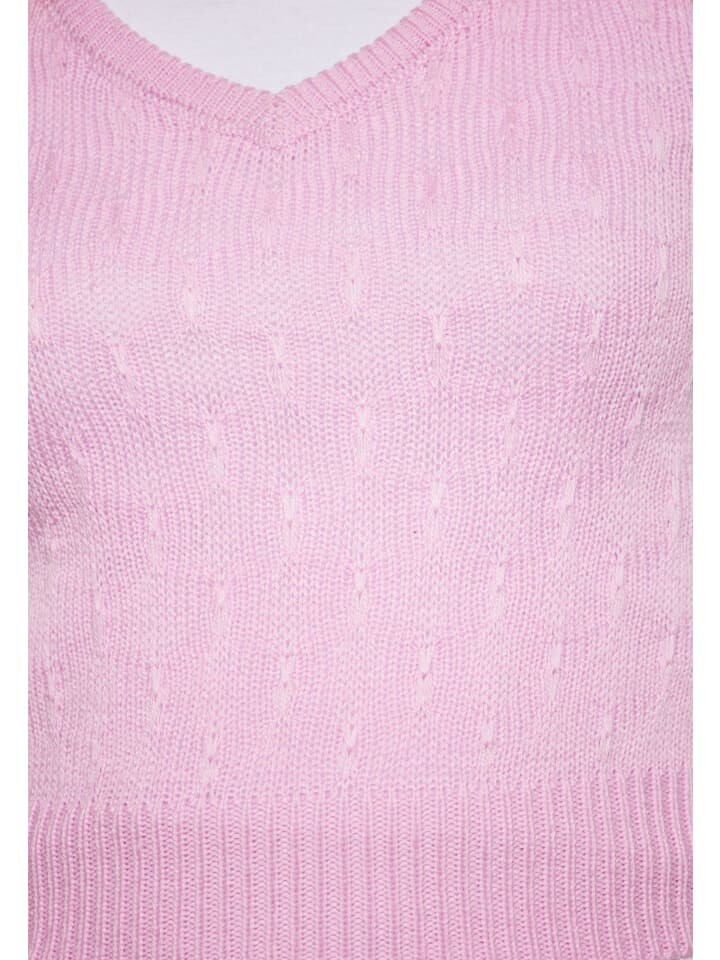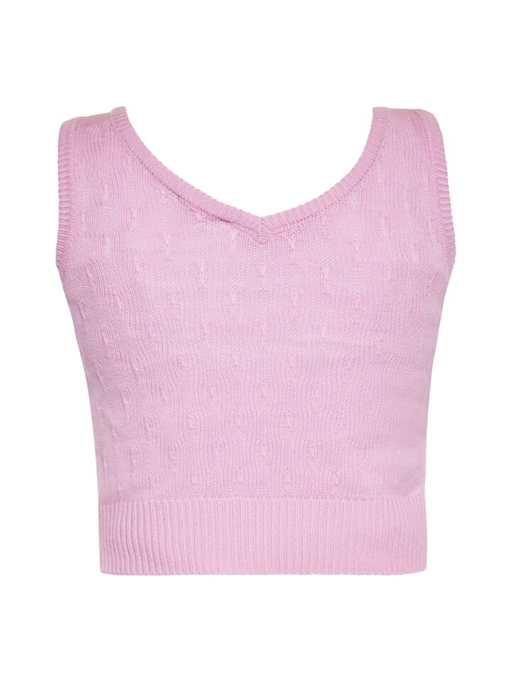 Представляем наш женский вязаный топ без рукавов – универсальное и стильное дополнение к вашему гардеробу. Этот топ, также называемый жилетом, имеет текстурированный узор из лицевых и изнаночных петель, образующих ребристые вертикальные полосы. V-образный вырез придает нотку элегантности, а края обработаны более тонкой резинкой для красивого вида.