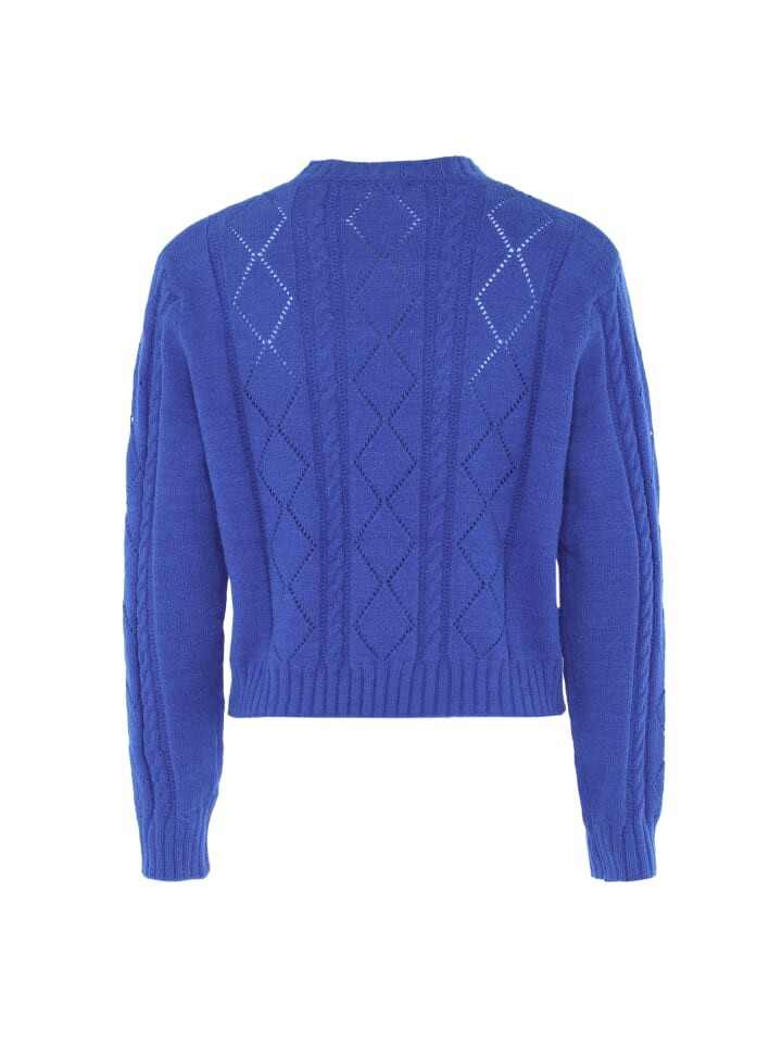 Этот вязаный свитер, выполненный с высокой точностью, имеет круглый вырез и длинные рукава. Ребристая отделка на воротнике, манжетах и подоле придает изделию изысканности. Текстурированный узор с вертикальной резинкой и диагональными узорами кос, образующими ромбовидные формы спереди, создают стильный образ. Слегка свободный крой и традиционный крой, доходящий до талии или чуть ниже, обеспечивает комфорт и элегантность для любого случая.