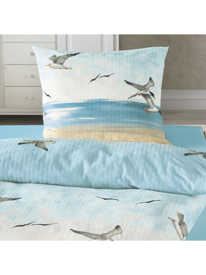 Создайте в своем доме образ пляжного домика с постельным бельем от Traum Schlaf. Рисунок воздушного постельного белья напоминает цвета моря и создает ощущение праздника вокруг кровати.