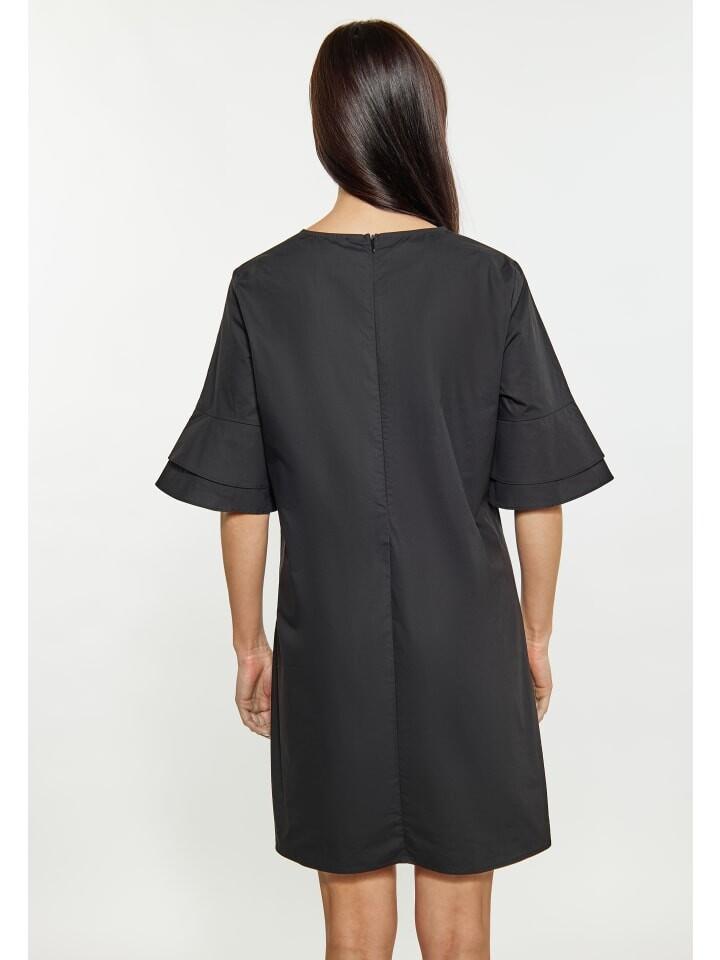 Это женское платье имеет тонкий и изысканный дизайн с V-образным вырезом и расклешенными короткими рукавами, создающими эффект колокола. Прямой силуэт элегантно доходит до колена и предлагает универсальность для разных случаев. Гладкая ткань с легким блеском придает ей элегантный вид, а открытая молния сзади обеспечивает легкость надевания. Идеально подходит для легкого перехода от повседневного к полуофициальному мероприятию.