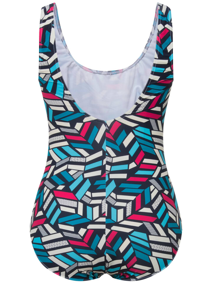 Купальник без мягких чашек, с графичным рисунком. Круглая горловина, спортивный вырез сзади. Лента под грудью, подкладка спереди.
