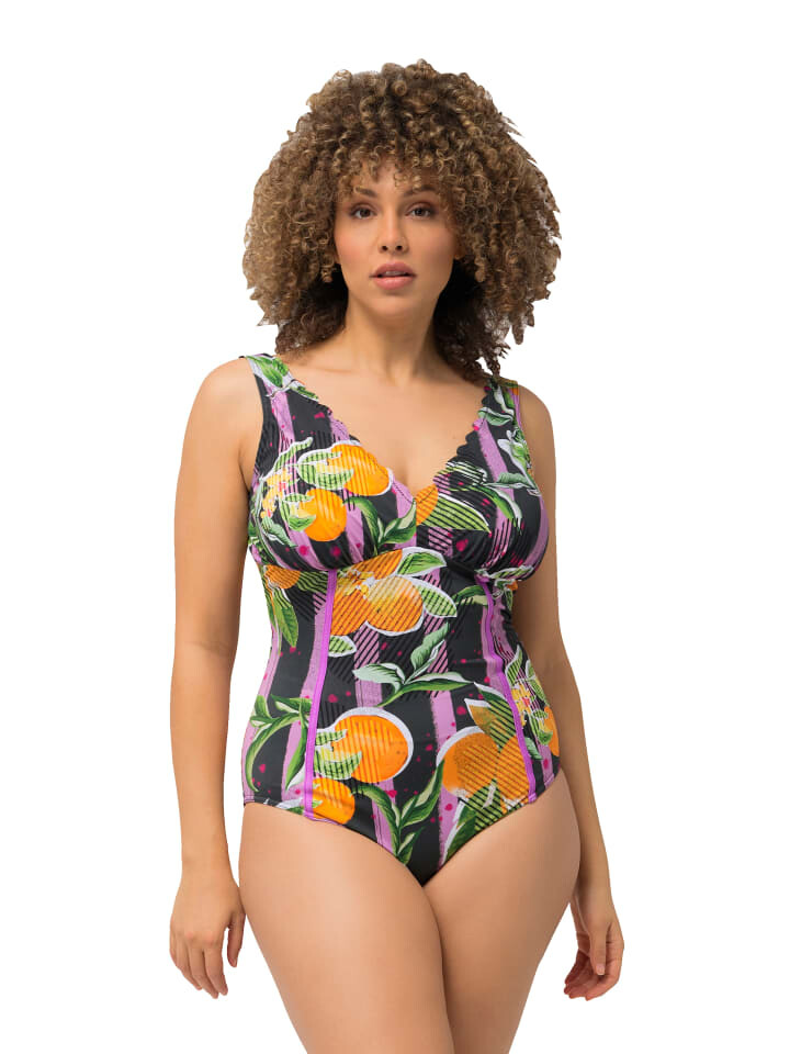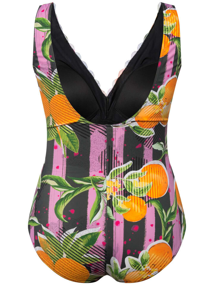Купальник с мягкими чашками, свежим оранжевым принтом и неоновой окантовкой спереди. Вырез по периметру украшен узором, вырезанным лазером. Пояс под грудью, подкладка спереди. OEKO-TEX.