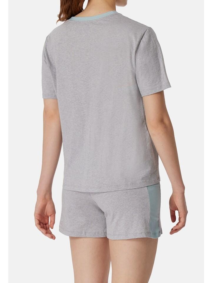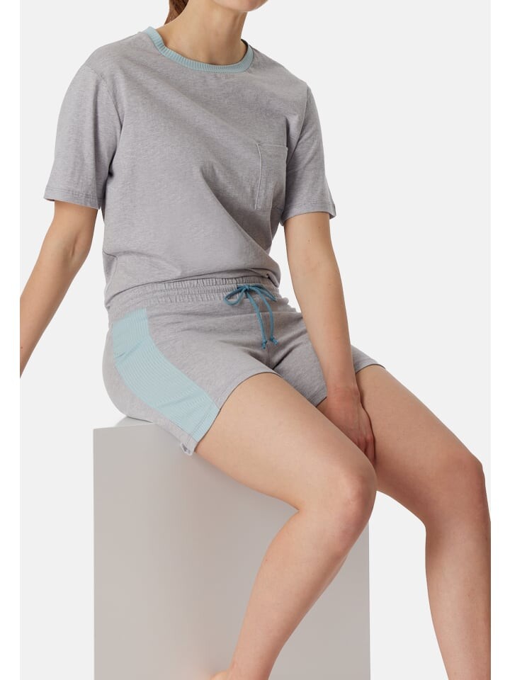 Короткая женская пижама из серии Casual Nightwear повседневного широкого кроя. Футболка с ребристым вырезом и большим нагрудным карманом. Брюки с ребристыми вставками по бокам и эластичным поясом с кулиской. Невероятно мягкий однотонный трикотаж высокого качества с хлопком.