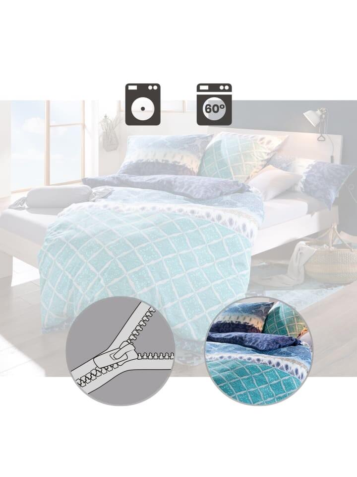 Прекрасное постельное белье Fleuresse из льна. Композицию различных графических узоров и орнаментов в свежих бирюзовых тонах дополняет двусторонний чехол для подушки. Абсолютное зрелище в вашей спальне. Их бархатисто-мягкий, уютный и теплый ворс обеспечивает комфорт холодными зимними ночами. Наслаждайтесь пушистой, дышащей и терморегулирующей тканью из тонкой мерсеризованной пряжи. Легко ухаживать и легко накрывать благодаря практичной застежке-молнии.
