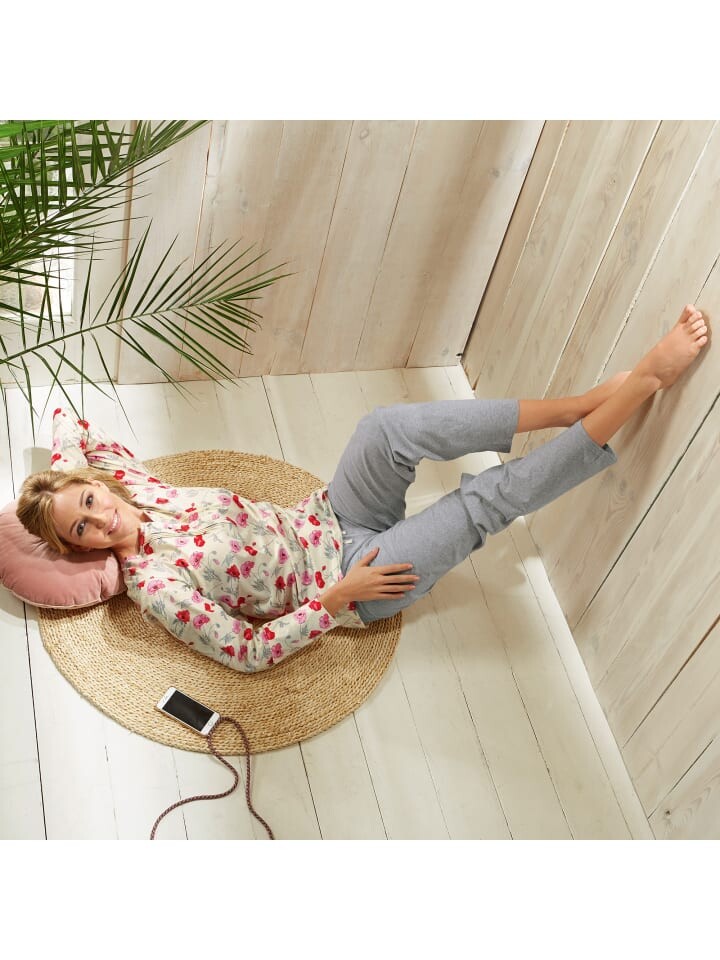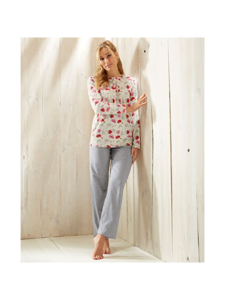 Женская пижама из одинарного джерси Erwin Müller. Женственное очарование для мечтательных ночей. Игривый топ с цветочным узором имеет круглый вырез и изысканную планку на пуговицах с декоративной окантовкой. Его прекрасно подчеркивает сплошной принт с маками. С этим сочетаются длинные брюки из меланжа с притачным эластичным поясом и цветной кулиской. Пижама мягкая и приятная на ощупь, ее очень удобно носить. Дышащая и простая в уходе.