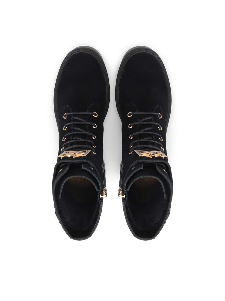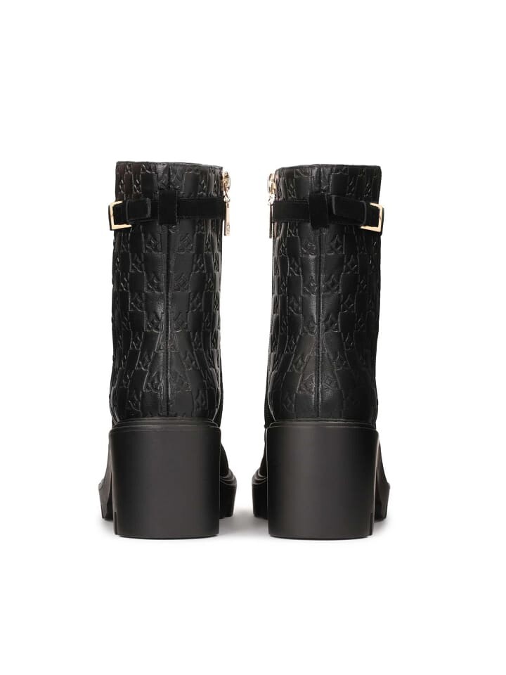 Женские ботильоны на толстом высоком каблуке удивительным образом сочетают мягкую замшу с узорчатой тисненой кожей. Высокое голенище на молнии также имеет классическую шнуровку для индивидуальной подгонки по ноге. Кожаный ремень с крупной металлической монограммой KAZAR привлекает внимание. Эти удобные ботинки идеально подходят для повседневного использования.