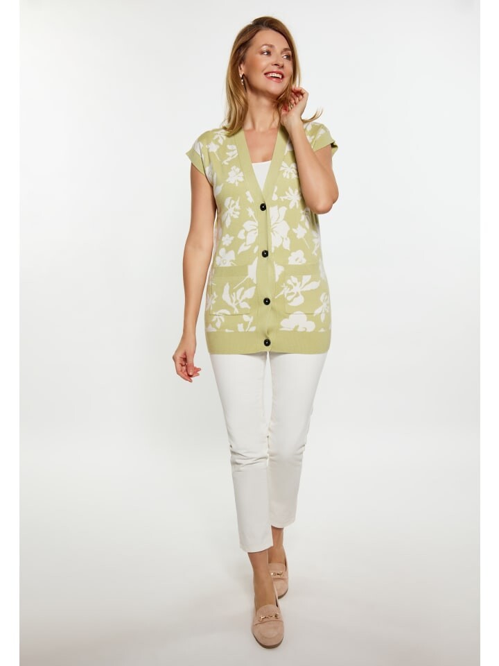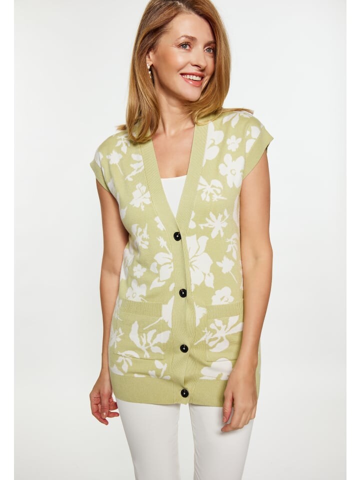 Свитер без рукавов из качественного трикотажа с красивым цветочным узором, застегивается на пуговицы. V-образный вырез красиво подчеркивает шею. Рекомендуется для любительниц женственного стиля.
