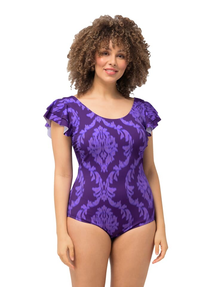 Купальник с мягкими чашками, элегантным принтом по всей поверхности и двойными воланами на плечах. Подкладка спереди, пояс под грудью.