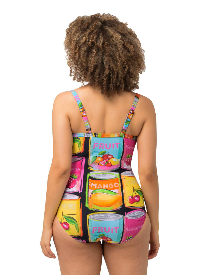 Купальник с мягкими чашками, ярким фруктовым принтом и драпированной декоративной лентой на талии. Бретельки-спагетти, пояс под грудью, подкладка спереди. Изготовлено из переработанных материалов.