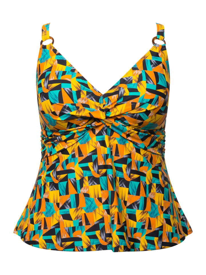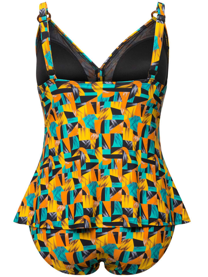 Танкини, состоящее из двух частей, с абстрактным принтом. Удлиненный топ с мягкими чашками, женственным драпированным бюстом. Пояс под грудью, подкладка спереди. Регулируемые бретели, трусики в тон. С переработанным полиамидом.