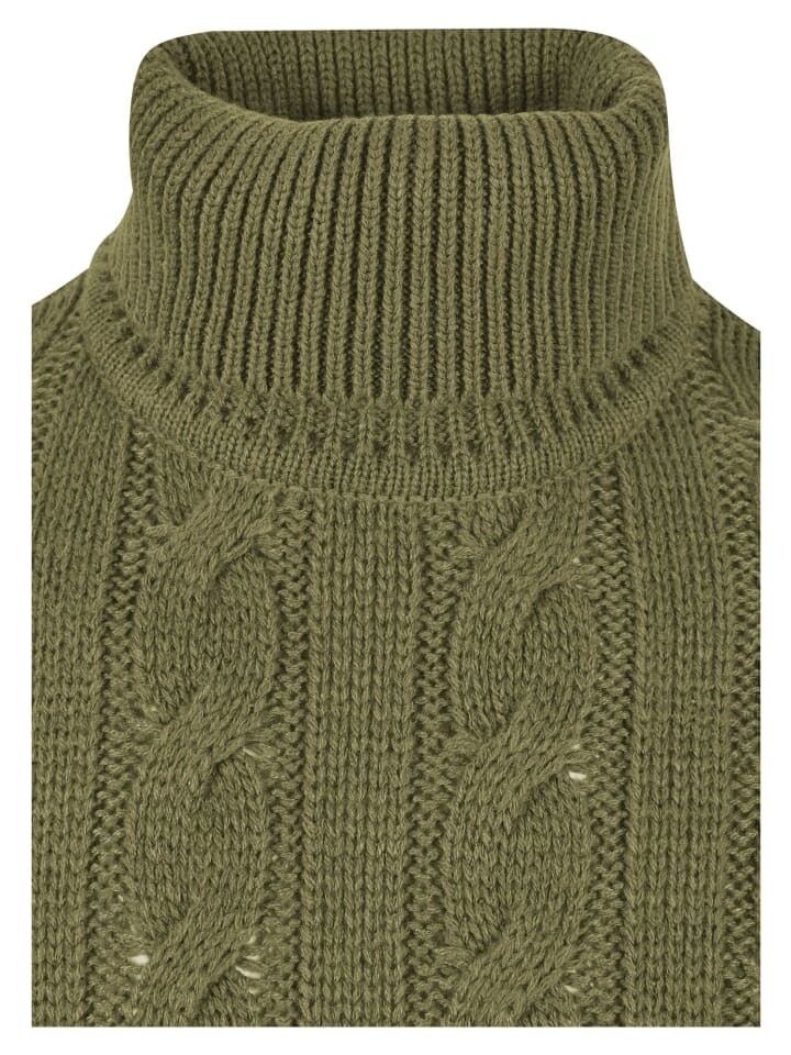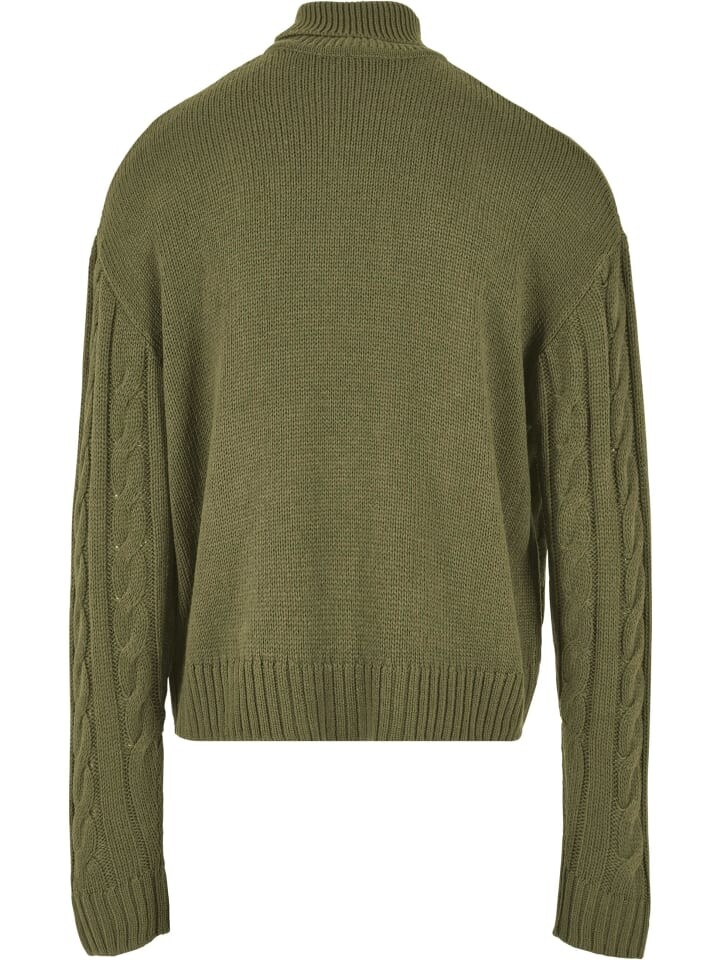 Мужской вязаный свитер имеет большую водолазку и расставляет акценты сменой узора. Рукава и перед вяжутся вертикальным косовым узором, спинка - простой. Широкие ребристые манжеты на рукавах и подоле завершают дизайн. Мужской вязаный свитер выполнен из прочного акрила, имеет объемный размер и заниженную линию плеч.